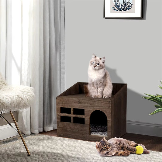 Wooden Cat Cave Bed Furniture Kitten Sleep Lounge House Bed with Cushion Pad Litter Box for Indoor Cats